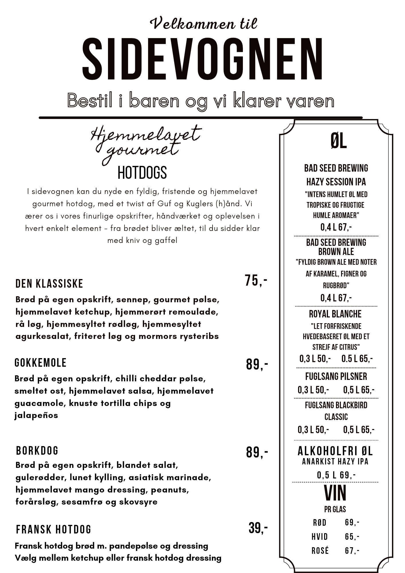 BEMÆRK: Sidevognens menukort ændres periodisk, ligeledes dets åbningstider, hvor Sidevognen lukker før ishuset, da der skal være god tid til en dessert, efter bunden er lagt.